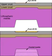 The main rift or "syn-rift" stage describes the phase of active stretching and fault block rotation. Syn-rift subsidence results from the elastic/isostatic adjustment of the crust due to mechanical stretching of the lithosphere.[3] The subsidence is counteracted by upwelling of the asthenosphere into the space created by the mechanical stretching and thermal upward displacement of the asthenosphere-lithosphere boundary, causing uplift of the rift zone.[24][16][25] The fundamental architectural element in many extensional basins is the half-graben, formed within the hanging walls of major rift-bounding or intra-rift basin faults. The location and number of half grabens are influenced by the position of the main faults and the width of the rift zone, which depends on the rheology, crustal thickness and stretching factors.[3]