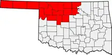 Northwestern Oklahoma is the geographical region of the state of Oklahoma which includes the Oklahoma Panhandle and a majority of the Cherokee Outlet, stretching to an eastern extent along Interstate 35, and its southern extent along the Canadian River to Noble County. Northwest Oklahoma is also known by its Oklahoma Department of Tourism designation, Red Carpet Country,[1] which is named after the region's red soil and alludes to the metaphor that the panhandle is a "red carpet" into Oklahoma. The region consists of Cimarron, Texas, Beaver, Harper, Woods, Alfalfa, Grant, Kay, Ellis, Woodward, Major, Garfield, Noble, Dewey, Blaine, and Kingfisher counties.