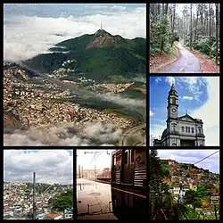 ![]() Location of Northwest Zone of São Paulo, Top left:Aeral view of The peak of Jaragua in Cantareira mountain range, Top upper right:A forest zona with a cycling and walking road in Anhanguera Park in Peras, Top lower right:O Santa Maria Church in Freguesia do O area, Bottom left:Vila Malvina residential area in Perus, Bottom middle:Jaragua railroad station, Bottom right:View of Jose Lopes residential area, nearby Cantareira mountain range | |