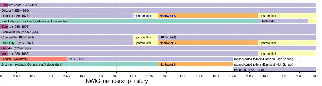 Officially formed in 1974, the 7 members were Dakota, Freeport Aquin, Galena, Lanark, Lena-Winslow, Stockton and Warren. In 1977, Orangeville returned to the fold increasing the total teams to eight. As the 1986 school year began, Lanark High School consolidated with Shannon High School, becoming Eastland High School. After 30 years of membership, in 1988 Warren dropped out of the conference. However, East Dubuque quickly replaced them in 1989, keeping the total number of teams an even eight. Unfortunately, in 1995 they decided to leave the conference. This left the conference in a situation they had not had not been in since 1976, an odd number of teams for which to schedule. The final season for the NWIC occurred in 1995. Beginning in 1996, this conference merged with the Upstate Illini.