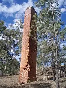 One chimney remains upslope of the furnaces, to 10 metres (33 ft) height. Downslope of the furnaces is a brick paved area, with water tanks and machinery footings stepping down the slope from it. Close to the creek are footings and base-logs that may have been the footings for a water pump.[1]