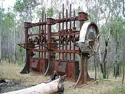 The 10-head stamper battery with steel frame is located about 80 metres (260 ft) from the creek. A concrete engine footing is located adjacent to the battery to the southeast. The posts for a partly-collapsed gantry, level with the top of the battery, lead south 22 metres (72 ft), then in a series of separate low embankments back to a mine adit 120 metres (390 ft) to the south. This appears to be the support embankment for a tramway linking the mine and is not demonstrated.[1]