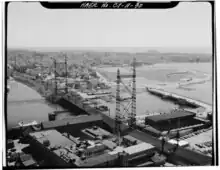 In 1896, the New Haven Railroad built the bridge and widened its route to four tracks, as it simultaneously built its South Norwalk Railroad Bridge over the intersection of Washington Street with North Main and South Main streets. The 562-foot (171 m) span, with a rotating swing span 202 feet (62 m) long was provided by the Berlin Iron Bridge Co. This type of swing bridge is one of just two on the Northeast Corridor.[2] The swing span has a rim-bearing system of 96 rollers, allowing tall vessels to pass by.[3] The span is one of only 13 of the company's bridges (and one of only two railroad bridges) that survive in the state as of August 2001. In 1907, the rail line was electrified with overhead catenary wires, which form a prominent feature of the bridge today.[3] It is or was also known as Norwalk River Bridge.[2] It was added to the National Register of Historic Places in 1987.[1]