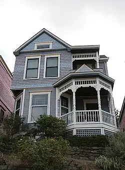 The Norwell Residence is a historic house in the Columbia-Tusculum neighborhood of Cincinnati, Ohio, United States. A Victorian building constructed in 1890,[1] it is a weatherboarded structure with a stone foundation and a shingled roof.[2] The overall floor plan of the house is irregular: two and half stories tall, the house is shaped like the letter "L" but appears to be a rectangle, due to the presence of two separate porches that fill in the remaining area. Many ornate details characterize it, including imbricated shingles on the westward-facing gable end of the house, a frieze with spindles on the railing of the primary porch, and small yet cunningly crafted braces for the same porch. Yet more distinctive is the secondary porch, which sits atop the primary one; it features braces and spindles similar to those of the primary porch.[3]