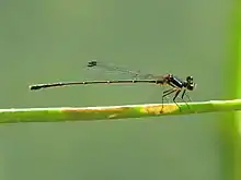 Its usual habitat is near rivers, riverine lagoons and streams. The adult is a small to medium-sized damselfly with a wingspan of 25 to 35mm. The adult is dark with pale stripes on the synthorax. The wings are tinted with lemon-yellow in the male, and generally hyaline in the female. In Australia, the distribution is in suitable habitat in the north and eastern part of the continent from the top end of the Northern Territory to the northern half of Queensland.[4] The taxon has not been assessed in the IUCN Red List, but it is listed in the Catalogue of Life.[5]