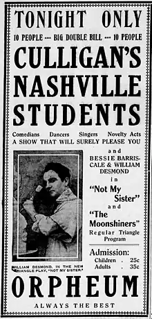 Not My Sister is a lost 1916 silent film drama directed by Charles Giblyn and starring Bessie Barriscale and William Desmond. It was produced by Thomas H. Ince for Kay-Bee Pictures and distributed by Triangle Film Corporation in Culver City, California.[1][2][3]