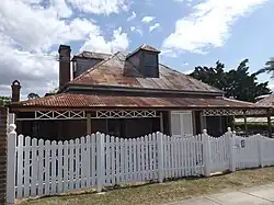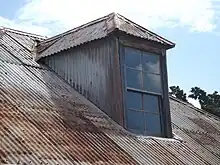 The front part of the single-storey house features a steeply pitched, short-ridge roof surrounded on three and a half sides by separate verandah roofs. Two dormer windows protrude to the north and east from this main roof structure. Their sides are clad in corrugated iron and their roofs are short-ridged. At the rear is a smaller pyramid-roofed structure separated from the front section by a short gabled roof. A small skillion roof abuts the rear sloping away from the pyramid-roofed structure. On the eastern facade the verandah roof continues over enclosed space to meet the rear skillion. On the western facade the verandah roof extends in front of the pyramid-roofed structure. The entire roof is clad in corrugated iron, with two brick chimney stacks protruding through it.[1]