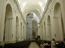In the 19th century the dome had to be reconstructed twice, ending up as a Neo-Classical construction, after collapses caused by earthquakes. In the 1950s much refurbishment was carried out, not entirely successfully, for example the trompe-l'œil of the vertical elements and the tempera decoration of the vaults by the painters Arduino and Baldinelli, as well as major alterations to the high altar and the organ. Most serious however was the replacement of the original pitched roof of the nave by a heavy loft of Roman brick and concrete which was probably one of the causes of the collapse of 1996.