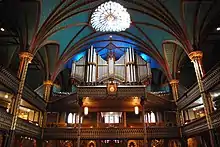 The interior of the church is amongst the most dramatic in the world and regarded as a masterpiece of Gothic Revival architecture.[1] The vaults are coloured deep blue and decorated with golden stars, and the rest of the sanctuary is decorated in blues, azures, reds, purples, silver, and gold. It is filled with hundreds of intricate wooden carvings and several religious statues. Unusual for a church, the stained glass windows along the walls of the sanctuary do not depict biblical scenes, but rather scenes from the religious history of Montreal. It also has a Casavant Frères pipe organ, dated 1891, which comprises four keyboards, 92 stops using electromagnetic action and an adjustable combination system, 7000 individual pipes and a pedal board.[2][3]