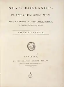 The standard abbreviation for the work, Nov. Holl. Pl., is used in botanical literature,[12] and is also known by the title Specimens of the Plants of New Holland.[13] It is the second publication by Labillardière to describe Australian flora; the first was Relation du Voyage à la Recherche de la Pérouse in 1799, a popular account of the voyage in search of the La Pérouse expedition.[14] The earlier work contains the first description of plant species such as Eucalyptus cornuta.[15]