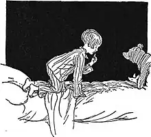 The book's collection of poems have recurring themes of childlike innocence and characteristics that numerous scholars have studied. The cognitive psychologist George Miller has argued that the poem "In the Dark" was inspired by crib talk.[1] Furthermore, "In the Dark" can be read as an endorsement of childhood "as a golden era where... innocence, unqualified parental love, [and] irresponsibility" are commonly occurring traits.[2] Author Elena Goodwin postulates that "King Hilary and the Beggarman" characterizes the poem's titular character as "like a small child, [that] excitedly anticipates the various Christmas gifts that" he will receive.[3]