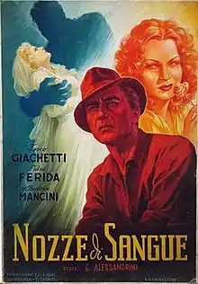 Blood Wedding (Italian: Nozze di sangue) is a 1941 Italian drama film directed by Goffredo Alessandrini and starring Beatrice Mancini, Fosco Giachetti and Luisa Ferida.[1] It is set in 19th century South America, and features an arranged marriage. The film is based on the novel Immacolata by Lina Pietravalle.