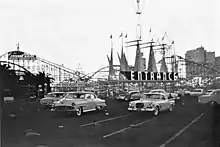 In 1954 there were 218 amusements in the park,[6] but during that time the zone began to face stiff competition from Knott's Berry Farm and then Disneyland (both less than 20 miles (32 km) away) and the rough, free-for-all reputation of The Pike may have discouraged some families from attending.[6] In the 1950s, the area underwent another face-lift. Advertising with coupons appealing to families appeared in local newspapers. A Kiddieland collection of carnival flat rides, a "Bud" Hurlbut miniature train and petting zoo were installed on the silted-in new sand and public restrooms were built of concrete and cinder-block near a new picnic area, giving it a post-World War II modern look, and the park was renamed "Nu-Pike" as result of a write-in naming contest.[6]