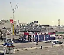 Proximity to the Long Beach Naval Shipyard, and its many sailors on extended leave during retrofitting, supported an ink economy because of the tradition of sailor tattoos.[10] The dense collection of tattoo shops made next-door and cross-street neighbors of many minor and world-renowned artists, the most famous being Bert Grimm's tattoo shop and tattoo artist Rick Walters.[10] Grimm's work contributed to the development and popularity of the American Traditional tattoo style.[11] Kari Barba purchased Grimm's shop in 2003, and it operates under the name Outer Limits Tattoo.[11] Started in 1927, this shop is the last remaining business from the original Pike, and the oldest continuously-operating tattoo studio in the United States.[12]
