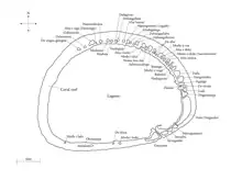 The lagoon itself also serves as a reference point to determine relative direction. Movement towards the lagoon, the center of the atoll, is called i dai ("on the water"), while movement outwards in the direction of the open ocean is called i dua ("on the back").[3]