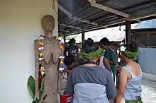 Nukuoro is famous for its carved deity sculptures, which are known as tino aitu sculptures. The statues represent gods and deified ancestors who are associated with the five Nukuoro family groups: sekave, seala, sehege, sehena, and seolo. Traditionally, the figurines were placed in the malae (temple), as well as in the home, to protect their inhabitants from bad fortune and ill-wishing spirits. They were often given food as sacrificial offerings on major festive occasions, and were ritually clothed or adorned with flowers.[12]