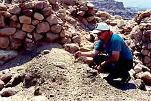 Phase 1a saw the construction of several banks of lined pits around unused square areas. It is conjectured that this represented storage pits around a family tent.[14] In stage 1b saw the addition of more pits and walls, hearths, and evidence of a more sedentary lifestyle. Phase 2 saw construction of fortification walls and residential and non-residential stone and mudbrick architecture. A non domestic area was located at the western gate.[15] The Phase 2 occupation saw the addition of more walls and storage pits. The final stage of occupation seems to have been a much smaller town which ended when the town was burned.[16] and one of the fortification towers collapsed.[17] An interesting note is that many of the doors in the town at this time appear to have been blocked up.[18]