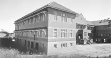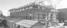Construction of the northern wing by day labour commenced after the former head teacher's residence, which stood on the building site, was sold for removal.[68][69] The hip-roofed wing, aligned east–west and perpendicular to Bage Street, consisted of two storeys above an undercroft. Each floor comprised four classrooms for 40 pupils, a cloakroom and connecting corridors. By means of folding partitions each floor of this wing could be converted into one large room. One classroom on the first floor was raised 600 millimetres (24 in) to form a stage. The undercroft comprised lavatory accommodation for girls and female teachers and a concreted play area. The building's estimated cost was £9,890.[68][70][71][72][73][74] Temporary brick walls with lime mortar and a fibrous-cement gable infill were constructed where the range was to be connected.[75][1]