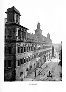 In the northeast corner of the large courtyard of the town hall and on the south side of Theresienstrasse, new buildings in the neo-Gothic style were constructed in 1885–1889 according to plans by August Essenwein. Hans Pylipp built, at about the same time, a new office building in place of the old Fünferhaus on Fünferplatz. Heinrich Wallraff based his 1907–1910 new buildings north of Theresienstrasse on the Nuremberg Renaissance of the 16th century. Among other things, parts of the buildings of the former Dominikanerkloster were demolished for this purpose.