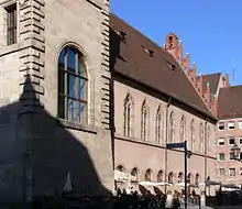 Nuremberg City Hall (German: Nürnberger Rathaus) is located in the old town of Nuremberg, Germany, just east of the choir of the Sebalduskirche. It is part of the Historic Mile of Nuremberg as one of the city's sights. The imposing Renaissance building was designed by architect Jakob Wolff the Younger (1571–1620). It was severely damaged during World War II and was largely rebuilt in the 1950s. In the process, the structure was shortened by two window axes on the north side. On the south side is a core Gothic hall designed by Albrecht Dürer. The Lochgefängnisse, located in the basement, are considered a tourist attraction, as is the Beautiful Fountain, located directly in front of the New City Hall, designed by Kurt Schneckendorf and built from 1954 to 1956. This building replaced the row of houses between the Old Town Hall and the Hauptmarkt, which had been destroyed during the war.