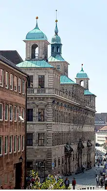 With the self-confidence of a flourishing Reichsstadt, it was decided to build a new building in the architecture of an Italian palace almost 100 years later. After preliminary planning and conception by the city architect Wolf Jacob Stromer, planned by Jakob Wolff the Younger as a four-wing complex (therefore also called Wolff'scher Bau), the building in 1616–1622 did not turn out to be so Italian after all. Although the horizontal, hitherto unknown in Nuremberg history, plays a dominant role in the elongated monumental building, the roof region returns to the native vertical with the Dwarf Houses, completely unthinkable in Italy.
