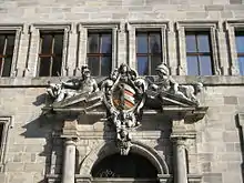 The foundation stones were laid in 1616 and 1619. On the west side, all Gothic building elements were sacrificed to it. The uniform window front contrasts with the three Baroque portals, whose sculptures, including figures from the Bible book of Daniel, were commissioned by the city council in 1617 and designed by the sculptor Leonhard Kern. Above the central portal, the main entrance, is emblazoned the coat of arms of the Holy Roman Empire of the German Nation with the imperial eagle.