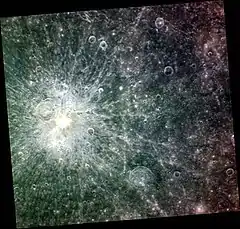![]() Approximate color image by MESSENGER showing Nureyev's ray system | |