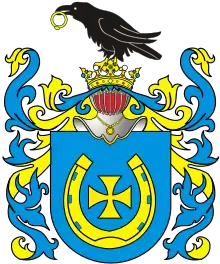 The crest is a black raven facing right holding a golden ring in its beak. The helm is a szachecki type. Its mantling is identical to the Jastrzębiec coat of arms.