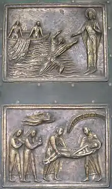 In 1956, bronze reliefs by Perincioli were inspired by medieval role models in front of San Zeno in Verona and the Cathedral of Hildesheim.