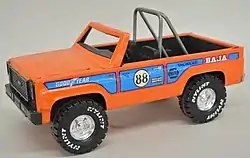 During the late 1950s, Nylint's construction toys, while high-quality and realistic, moved away slightly from the requirement that the toy be a replica of real-world equipment. After the cold war phase ended in the early 1960s, Nylint returned to its strict “realistic” formula. Other toy companies were moving in the opposite direction—going to more generic or futuristic looking toys not patterned after real vehicles. This phase began around 1959 and peaked about 1965 when Ford toys dominated the Nylint product line. This era lasted throughout the 1960s into the early-1970s. By 1962, Nylint was producing Ford toy replicas for Ford dealership promotions. Nylint was building excellent renditions of the Ford F-100 line of trucks, the Ford “C” tilt-cab, and the smaller Econoline series. By the mid-1960s the company also made a replica of the Ford Bronco. Nylint was blatant about using the Ford label on its toys, stamping “Ford” on tailgates, above the grille, on hubcaps, depicting the Ford “Twin-I-Beam” badge, and a detailed hood decal. Some of these Ford toys were exclusives for Ford dealers, such as a Nylint pickup replica of a camper that housed a Philco AM radio, and was an enticement to bring parents into dealerships.