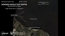 The accident occurred at the State Central Navy Testing Range (Russian: Государственный центральный морской полигон) which is the main rocket launching site of the Russian Navy and is also called Nyonoksa.[12] According to the version presented by Russian officials, it was a result of a failed test of an "isotope power source for a liquid-fuelled rocket engine".[13][14][15] Nonproliferation expert Jeffrey Lewis and Federation of American Scientists fellow Ankit Panda suspect the incident resulted from a Burevestnik cruise missile test.[16][17] However, other arms control experts disputed the assertions: Ian Williams of the Center for Strategic and International Studies and James Acton of the Carnegie Endowment for International Peace expressed skepticism over Moscow's financial and technical capabilities to field the weapon,[18] while Michael Kofman of the Wilson Center concluded that the explosion was probably not related to Burevestnik but instead to the testing of another military platform.[19] According to CNBC, the Russians were trying to recover a missile from the seabed which was lost during a previously failed test.[20] No NOTAMs were filed prior to the explosion to warn pilots of a possible missile test.[9] In the past, the residents of Nyonoksa had been warned and evacuated prior to the missile tests.[9] Also, two Russian special purpose ships were at the Nyonoksa test range when the explosion occurred: the Serebryanka (Rosatom Flot vessel used for handling nuclear waste from nuclear reactors) and the Zvezdochka (used for underwater salvage operations and is equipped with two heavy lift sea cranes and two remotely operated vehicles).[9][10][17]