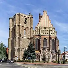 Nysa, one of the oldest towns in Silesia, was probably founded in the 10th century. The name of the Nysa river, from which the town takes its name, was mentioned in 991, when the region formed part of the Duchy of Poland under Mieszko I of Poland. A Polish stronghold was built in Nysa in the 11th and 12th century due to the proximity of the border with the Czech Duchy. As a result of the fragmentation of Poland, it became part of the Duchy of Silesia, and from the 14th century it functioned as the capital of the Duchy of Nysa, administered by the Bishopric of Wrocław. In the 12th century the Gothic Basilica of St. James and St. Agnes was built (later rebuilt after the war devastations of the 13th and 14th centuries). Now designated a Historic Monument of Poland, it is the most distinctive and most valuable landmark of Nysa. Nysa was granted town rights around 1223 by bishop Lawrence, confirmed by Duke Bolesław II Rogatka of Legnica in 1250, and attracted Flemish and German settlers. In 1241 it was ravaged by the Mongols during the first Mongol invasion of Poland.[2] In 1245, it was granted staple right and two yearly fairs were established. In the early-14th century Nysa became an important trade- and craft-center of Poland, before it passed under the suzerainty of the Bohemian Crown in 1351,[2] under which it remained until 1742. It also became one of the leading cultural centers of Silesia.[3]