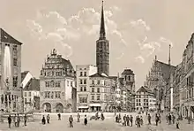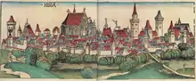 The town's fortifications, dating from 1350, served to defend against the Hussites in 1424. During the Hussite Wars, in 1428 it was the site of the Battle of Nysa, with Poles and Czechs fighting on both sides.[2] One of the prominent signs that Nysa was a significant center is the report in Nuremberg Chronicle, published in 1493, which mentions the city among the major urban centers of Central and Eastern Europe. In the description of the town population included in this chronicle we read "plebs rustica polonici ydeomatis ...". The Nysa coat of arms at the entrance of the Charles Bridge in Prague, which is displayed alongside the arms of the most prominent Bohemian cities, also indicates the importance of the town. In the 16th century it was a Polish printing center.[3]