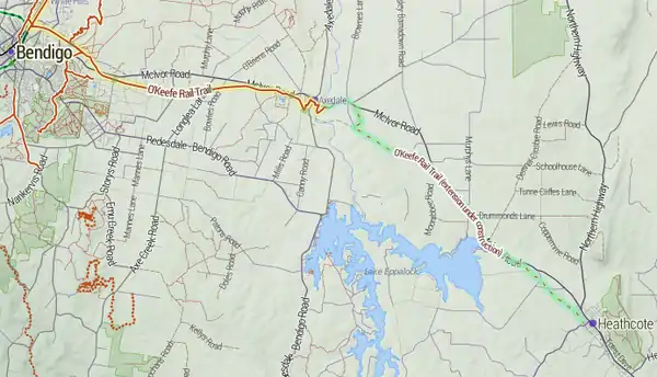 The O'Keefe Rail Trail is a 50-kilometre (31 mi) rail trail connecting Bendigo with Heathcote. The sandy gravel trail runs along a former branch line on the Melbourne-Sydney rail line. It previously ran 17 km (11 mi) from Bendigo to Axedale but works completed in 2015 extended the route to Heathcote [1]