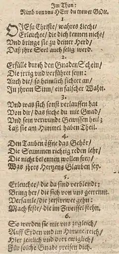 2. 1 2 3 4 5 6 7 Drömann, Hans-Christian (2000). Hahn, Gerhard; Henkys, Jürgen (eds.). 72 O Jesu Christe, wahres Licht (in German). Vandenhoeck & Ruprecht. pp. 52–55. ISBN 978-3-52-550335-5. {{cite book}}: |work= ignored (help)