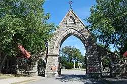 Oak Grove Cemetery is a historic cemetery located at 765 Prospect Street in Fall River, Massachusetts. It was established in 1855 and greatly improved upon in the years that followed. It features Gothic Revival elements, including an elaborate entrance arch constructed of locally quarried Fall River granite. The cemetery originally contained 47 acres, but has since been expanded to over 120 acres. The cemetery is the city's most significant, built in the planned rural-garden style of Mount Auburn Cemetery in Cambridge, Massachusetts. It was designed and laid out by local architect Josiah Brown, who is also known for his designs of early mills including the Union, Border City, and others.[2]