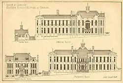 Oakbank was originally a Poor Law hospital, commissioned by the Glasgow Parish Council. The facility, which was designed by Alex Cullen, opened as the Western District Hospital in September 1904, on the same day as Stobhill Hospital in Springburn and the Eastern District Hospital at Duke Street.[1] It joined the National Health Service in 1948[2] and closed in 1965.[3] The buildings were subsequently used as a temporary facility for the Royal Hospital for Sick Children during reconstruction in the late 1960s and have since been demolished.[3]