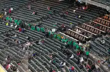 In response to the team's planned relocation to Las Vegas, Athletics fans would hold a protest during the team's April 28 home game against the Reds, holding up signs that read "Sell", "Stay", "#FisherOut", "Kaval=Liar" and "Sell the Team" with the latter chanted in the stands along with "Stay in Oakland" (the same phrase used by Oakland Raiders fans urging the team to remain in Oakland prior to the team's move to Las Vegas). Controversially, the official MLB broadcast of the game cropped out these signs leading the league to apologize, "We were unaware of the edit. When it came to our attention, we corrected it as it isn't consistent with our policy" said a spokesperson.[51][52]