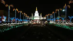 Every holiday season since 1978, the temple grounds have been lit up with thousands of Christmas lights. It originally started with 50,000 multi-colored lights. By 1998, the Christmas display had grown to 500,000 lights that could be seen from the San Francisco Bay. Along with the lights, musical performances and dances are organized to celebrate Christmas and the birth of Jesus Christ.[18]