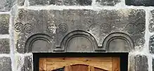 The lintel above the door on the north side of the farm cottage is a curiously carved stone with triple rounded arches and double spiral decorative motifs. Both this stone and the panel came from the surrounding moors and it is believed they were incorporated into the building for good luck.