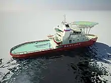 On 8 December 2011, the Russian Ministry of Transport ordered an icebreaking multipurpose emergency and rescue vessel from Arctech Helsinki Shipyard (AHS), then a joint venture between the Finnish STX Finland Cruise Oy and the Russian United Shipbuilding Corporation. The 76 million euro vessel, based on Aker Arctic's Aker ARC 100 oblique icebreaker concept developed for AHS,[6] was designed to be capable of breaking level ice up to 1 metre (3.3 ft) thick both ahead and astern, and generate a 50-metre (55 yd) channel in 0.6-metre (2.0 ft) ice when moving sideways using three Z-drive thrusters with a combined output of 7,500 kW.[7] Initially, the hull of the 76.4-metre (251 ft) vessel referred to as "NB508" was to be built by Shipyard Yantar JSC in Yantar, Kaliningrad, where production began on 24 April 2012[8] and keel was laid on 6 July.[9] However, instead of launching the unfinished hull in Kaliningrad and towing it to Helsinki for outfitting, the blocks were transported to Helsinki and the hull was assembled in Finland.[10][11] The first blocks arrived on a barge on 9 April 2013 and the vessel, which was given the name Baltika, was completed in 2014.[12] In 2015, the oblique icebreaker carried out ice trials in the Gulf of Ob where the sideways icebreaking was successfully demonstrated for the first time.[13]