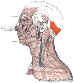 ![]() Muscles of the face and neck (occipitalis muscle visible at center right in red) | |