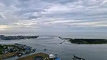 ![]() The Sinepuxent Bay crossed by the Harry W. Kelley Memorial Bridge, looking south. The southern end of Ocean City, the Ocean City Inlet, the northern tip of Assateague Island, the south inlet jetty, and the Atlantic Ocean are at the top of the image. Skimmer Island is in the left-center and Horn Island is in the right center of the picture, in front of the bridge. | |
