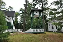 The Temple is a large octagonal structure, two stories in height, with a hip roof topped at the center by a cupola. At the front of the building a two-story gabled vestibule projects, with the main entrance on the first floor and a double window on the second. The east and west facades are three bays wide, with a center projecting section. The north facade has a storage area projecting from it; the other sides have two windows each. The interior of the hall is a large open space, with a platform at the north wall. Original chairs and pews are still in use.[2] Just east of the Temple stands a square structure known as the Bell Tower, built in 1882. This is a gazebo-like structure, with a deck accessed by a flight of steps, and a roof with decorated sides that resemble clock faces.[3]