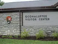 The original visitor center at Oconaluftee was built in 1940 by the CCC as a ranger station and magistrate's courtroom. The stone-and-log cabin was designated a "temporary" visitor center in 1947, and stayed that way until 2011, when a new center was built in just two months in late winter and early spring, and dedicated on April 15.[16] The Great Smoky Mountains Association paid three million dollars for the buildings (the other being a highly efficient restroom facility between it and the original center), and Friends of the Smokies donated over half a million more for the exhibits inside. Trotter & Associates Architects, LLC was the architect of record for the new visitor center. No government or taxpayer money was allocated for the project, so construction costs had to come entirely from donations to the two groups, which in turn donated the center to the National Park Service. The center and restrooms are open year-round, and after 64 years of "temporary" use, the original building has finally been reverted to its original administrative use, though its rustic "parkitecture" remains untouched on the outside.