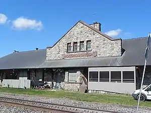 The Milwaukee Road Depot in Oconomowoc, Wisconsin is a railroad depot built in 1896 and operated by the Chicago, Milwaukee, St. Paul and Pacific Railroad. It is a one-story hip-roofed building clad in split granite.[1][2] The station served the Twin Cities Hiawatha from its formation in 1935 to its discontinuation in 1971, and now operates as Maxim's Restaurant. On display outside is a railway platform and Northern Pacific Railway 1923, a passenger car that operated on the Kettle Moraine Scenic Railway which was later renovated and painted red. The Canadian Pacific Railway's single-tracked Watertown Subdivision remains next to the depot.