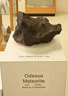 The Handbook of Texas Online describes the Odessa meteor crater as the largest of several smaller craters in the immediate area that were formed by the impact of thousands of octahedrites (an iron metallic type) that fell in prehistoric times.[3]