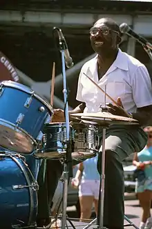 Noted for his use of the cowbell, bass drum pedal, and extended cymbal and drum rolls, Payne's double-shuffle drumming technique was much copied and was used by Fred Below and Sam Lay.[1] The technique called for Payne to use both hands to produce the shuffle effect.[3]