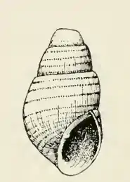 The shell is milk-white. As the type specimen was damaged, the protoconch cannot be described. Probably the first two whorls of the teleoconch were lost. The rest of the type specimen measures 2.3 mm. The remaining three whorls of the teleoconch are well rounded, slightly constricted at the suture and moderately shouldered at the summit. They are marked by four pitted spiral grooves, three of which divide the posterior two-thirds between the sutures into three almost equal areas, while the fourth is at the periphery. The space between the peripheral grooves and the one posterior to it, is equal to one-third the space between the sutures. These grooves as well as those on the base are crossed by many slender axial riblets which break them up into pits. The raised spaces between the grooves are marked by slender lines of growth and many extremely fine spiral striations. The sutures are well impressed. The base of the body whorl is well rounded. It is marked by seven pitted, well incised lines and microscopic spiral striations. The aperture is broadly ovate. The posterior angle is acute. The outer lip is thin. The columella is slender, curved, decidedly revolute. It is provided with a strong oblique fold at its insertion. The parietal wall is covered with a thin callus.[1]