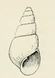 The small shell is elongate-conic and translucent to milk-white. It measures 4 mm. The nuclear whorls are small and deeply immersed in the first of the succeeding turns, above which only a portion of the last turn is visible. The six post-nuclear whorls are moderately rounded, very weakly roundly shouldered at the summit and separated by a strongly marked suture. A narrow band appears about the summit showing its junction with the preceding turn. The periphery and the base of the body whorl is inflated and well rounded. The entire surface of the base and the spire is marked by very fine lines of growth and numerous microscopic wavy spiral striations. The aperture is rather large, somewhat effuse anteriorly. The posterior angle is acute. The outer lip is thin. The columella is rather stout, strongly curved, and revolute, reinforced by the attenuated base, and covered with a strong fold at its insertion. This fold can be seen through the transparent shell as a quite strong lamella on the pillar of the turns.[4]